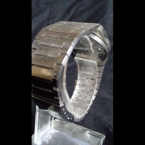 Cette Silver Sabre des années 1980 est un classique, elle est de taille moyenne et conçue à l'origine pour les hommes, mais aujourd'hui, elle passerait facilement pour une montre pour femme, mesurant seulement 34,5 x 33,5 mm.