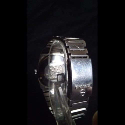 Le cadran gris est en bon état avec des strass tout autour et a des marqueurs individuels à 12, 3, 6 et 9. Il a des aiguilles en forme d'épée avec des secondes de balayage élégantes et une fenêtre date / jour à la position 3 heures