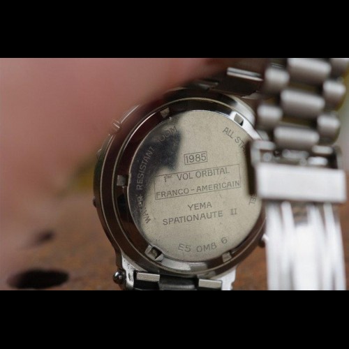 Sur le fond : 1985 premier vol orbital franco-Américain Yema spationaute II E5 OM8 6
